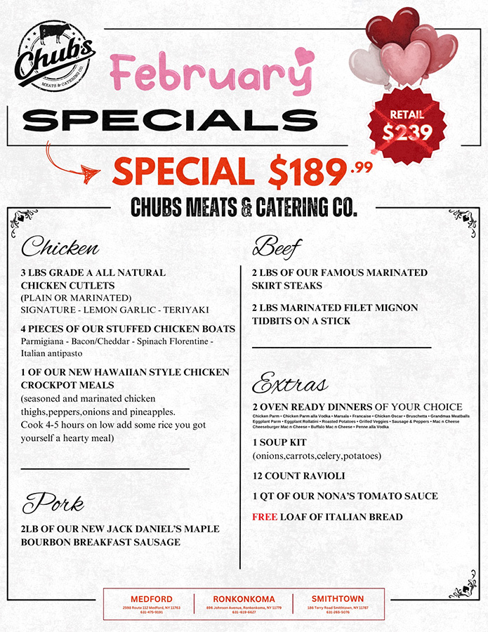 Chicken Parm • Chicken Parm alla Vodka • Marsala • Francaise • Chicken Oscar • Bruschetta • Grandmas Meatballs Eggplant Parm • Eggplant Rollatini • Roasted Potatoes • Grilled Veggies • Sausage & Peppers • Mac n Cheese